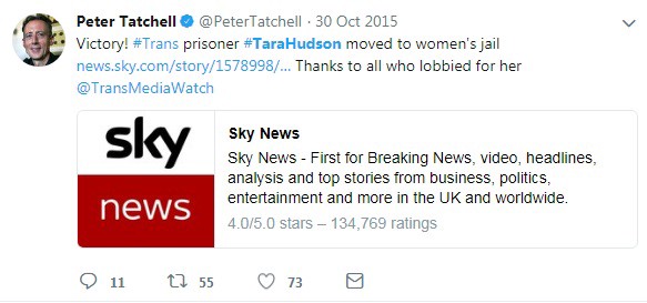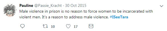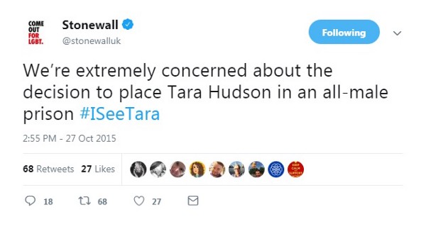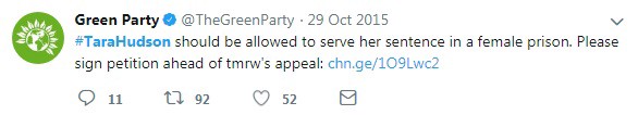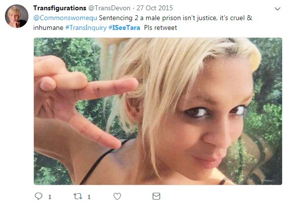 The bigger public story though was of Tara Hudson, a male transgender offender who caught the public imagination with the help of a convincing, if pornified, feminine appearance. A huge public campaign was set up and promoted via a Change.org petition, which received massive publicity on social media. Thousands of people got involved in the campaign. Some of the people backing Tara were politicians: