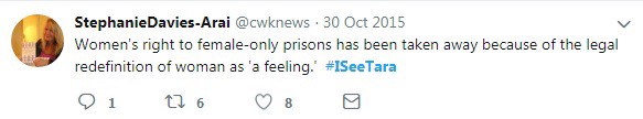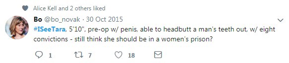 Fast forward to September 2018 and Tara Hudson popped up again, this time as the trans guest on Victoria Live on BBC 2 to debate the recent case of Karen White. The other guests were a former professional acquaintance of White’s and Dr Nicola Williams from campaign group Fair Play for Women. Surprisingly, to start with, all guests were in agreement that White should never have been transferred to a women’s prison in the first place. However, factions appeared when the reasons behind these views were expressed. In the eyes of feminists White should not have been transferred to a women’s prison because he is male. It’s that simple. Women have had that protection in place for a long time and there is no sensible reason to change it now. Hudson though took exception to this, as in his view it was because White wasn’t a *real* transwoman like himself. Hudson was so agitated about this point he ended up being rather rude to Victoria Derbyshire on national TV.