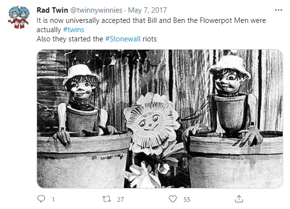 The popular image of twins, particularly children, is mischievous, naughty and cute, which makes it difficult to see a different picture or to get across the downside. To twins themselves growing up, it’s a form of brainwashing. With any other marginalised community we might call it ‘stereotype threat’. So pervasive is the public perception that it seems almost churlish to disabuse anyone of their belief that being a twin is nothing more than having a best friend for life and who wouldn’t want that? Trans people might set great store by their inner ‘identity’ but what if there is no individual inner identity to defend? Brought up on Bill and Ben, Pinky and Perky and Tweedledum and Tweedledee, and dressed identically throughout childhood, it is clear to an identical twin right from the start that the only identity available is as part of a unit. We never hear about Bill, Pinky or Tweedledee on their own. Even the thought of it is slightly embarrassing, somehow inappropriate. So strong is this indoctrination that twins themselves can find it too threatening to contemplate. And don’t even start me on pronouns. Insisting on other people referring to you as she/her is the height of singleton privilege when your pronouns have been they/them for as long as you can remember, entirely without your choosing.