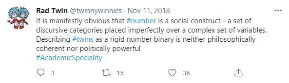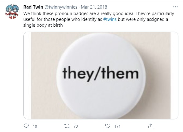Trans rights groups are always banging on about pronouns. Words conventionally used to denote sex are being repurposed to represent ‘gender’, for the benefit of 0.3% of the population. The demand that people put their pronouns in their email signatures or Twitter bios is defended as a nod to the idea that we cannot always tell someone’s ‘gender’ from their name or appearance, whereas in reality of course we can tell someone’s sex with almost unerring accuracy. This is an unrealistic expectation of the majority. In my quest for my twin identity to be always recognised and honoured I could claim that nobody’s ‘number identity’ should be assumed on a first meeting and that therefore it should become normalised to ask every new aquaintance whether or not they are a twin. Singleton status should not be the default because it ‘others’ those of us who are twins. (I think that this was in fact one of the first demands of Rad Twin on Twitter, and, rather winningly, some of our early allies agreed to it…)